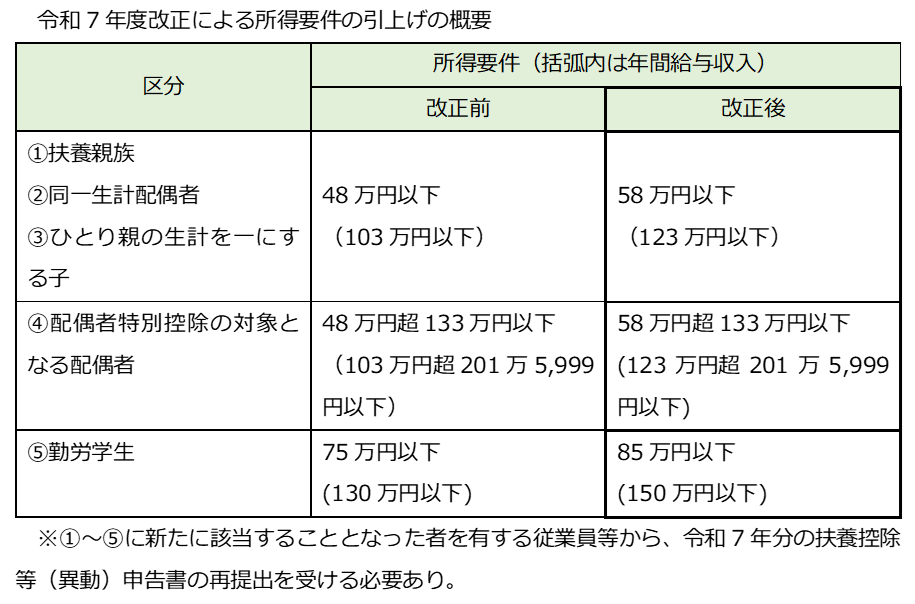 例えば、①扶養親族、②同一生計配偶者における所得要件について、改正前は48万円以下(年間給与収入103万円以下)であったところ、改正後は58万円以下(年間給与収入123万円以下)と、10万円引き上げられています(給与収入においては20万円)。