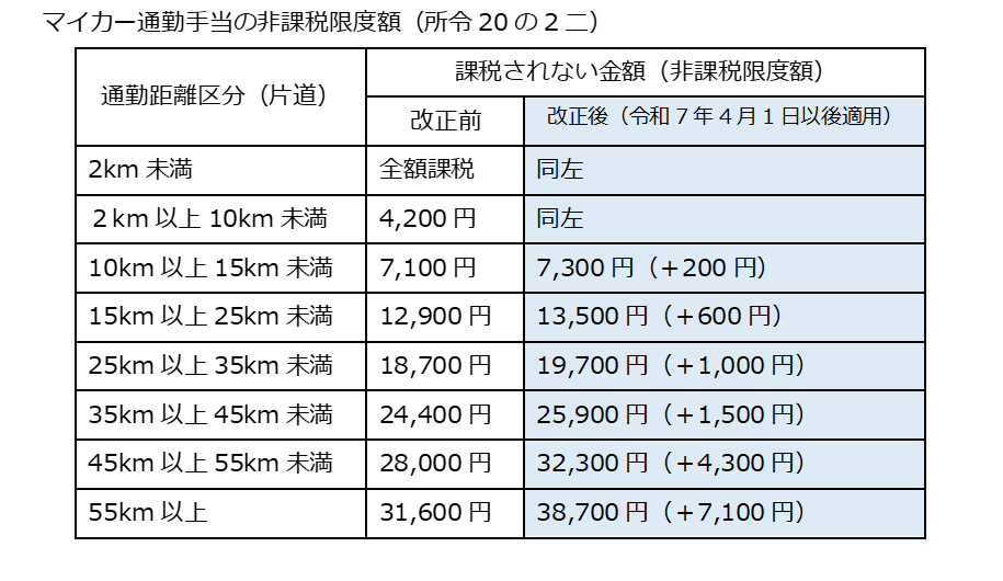 会社が従業員に支給する通勤手当の1か月当たりの非課税限度額を定める所得税法施行令第20条の2が改正されました。各通勤距離の区分は変わらず片道「10km以上15km未満」から「55km以上」の各区分の非課税限度額がそれぞれ引き上げられています。